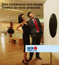 Hei, iata interpretarea reala, via Gadamer&mama Omida,: tanti are rochia sfasiata la spate, de la un tango ratat (in alt spot, parca!), iar bulina neagra e un sample de stofa de cusut la rochie, iar nenea cu cravata rosie gandeste la fel ca ea: cu bulina sau nu, creditul de nevoi personale te poate ajuta sa iti refaci vestimentatia degradata! Hm, iar BCR e firma cu ata si acul, nu? Curata tampenie, copirait angoasat, layout urat, idei ioc. Hei, ca sa continuu, nu-i asa ca nenea becere seamana cu musiu Sarkozy?!