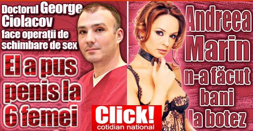 Nefiind cititori obisnuiti, sintem tentati sa si citim cite ceva. Bad idea… O facem tot de la stinga la dreapta, in mod firesc. Si tot in mod firesc citim intii literele mai mari si mai colorate, nu? Asa ca din enuntul „el a pus penis la sase femei”, subiectul devine oarecum dezamagitor. Doar la sase? George nu pare chiar „in his twenties”, iar inceputul de chelie avansata si privirea patrunzatoare ne-au sugerat, in prima faza, un eventual palmares mai bogat. In fine, trecind la textul mai mic, aflam ca, desigur, nu era vorba despre penisul lui. Dupa care totul capata sens. Din relationarea evidenta dintre cele doua personaje si admitind ca in lumea glamuroasa a vedetelor din Romania este posibil orice, urmatoarea concluzie ar putea fi aceea ca Andreea Marin este una dintre clientele/pacientele lui Ciolacov. Incredibil! Andreea Marin are penis? Adica al ei, la purtator, nu doar cel vesel si dansator din pelvis? In cazul asta, oare penisul Andreei o fi mai performant decit cel al lui Stefan?